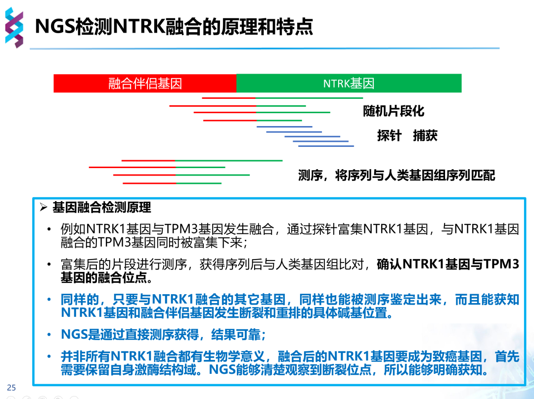 NGS检测在将NTRK融合基因碎片化后,通过探针将NTRK基因与融合基因富集,再进行测序并与人类基因组序列匹配,以获知NTRK基因与融合基因的断裂重排位置等具体信息。NGS需要的样本量少,通过直接测序获得信息、高度敏感,结果可靠,可在短时间内对多个基因进行平行测序,多重检测,通量高,一次覆盖NTRK所有亚型及常见和罕见靶点,结果全面而准确。