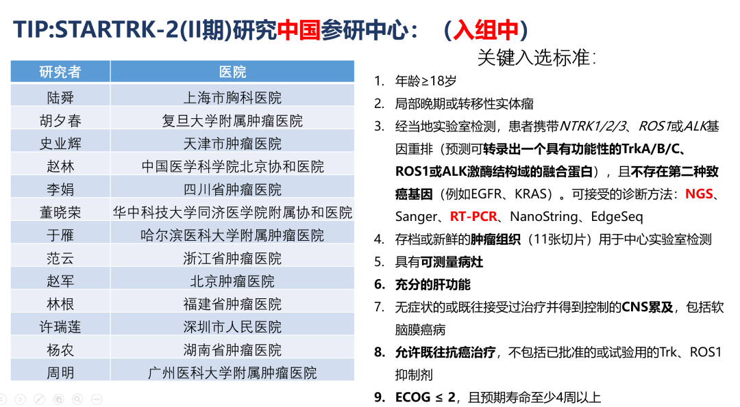 陆舜教授:我十分认同您的观点,在对STARTRK-2研究设计时,虑及儿童患者对药物的耐受程度和安全性,在最终的患者入选标准中仅纳入18岁以上的成人患者。对于儿童患者的疗效和安全性的分析,还需更严密、更谨慎的对待。
