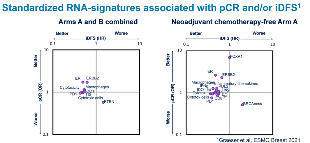 研究还进行了早期穿刺病理评估,将3周后低细胞密度、Ki67较基线下降>30%定义为“早应答”。双靶化疗组中“早应答”患者的pCR高达95%。去化疗组中,HER2低表达以及PAM50基底样亚型患者中没有观察到pCR。同时通过转化研究发现,免疫相关因子富集与pCR和生存呈正相关。