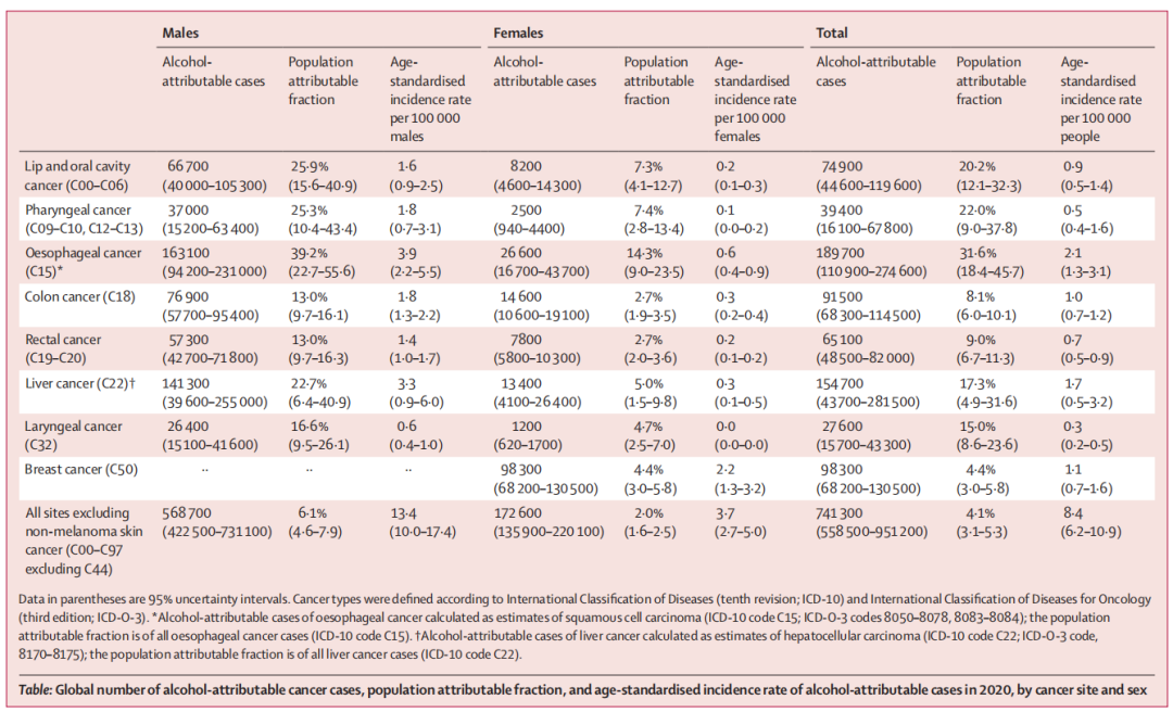 在这项以人群为基础的研究中,研究者使用全球酒精与健康信息系统(假设从饮酒到癌症诊断之间有10年的潜伏期的理论)最低终身戒酒风险暴露和2010年酒精消费估计,计算了人群可归因分数(PAF),结合来自WCRF持续更新项目的系统文献综述的相应相对风险估计数,应用于GLOBOCAN 2020的癌症发病率数据,以估计可归因于酒精的新癌症病例。我们还计算了中度(每天<20 克)、高度(每天20~60 克)和重度(每天> 60 克)饮酒对酒精所致癌症总负担的贡献,以及10 g每天增量(最多150 g)。95%的不确定性区间(UI)是使用类似蒙特卡罗的方法估计的。