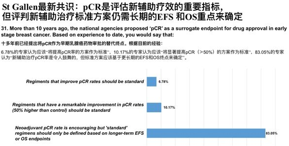 pCR是评估新辅助疗效的重要指标,十多年前已经提出将pCR作为早期乳腺癌药物审批的替代终点。今年St.Gallen最新共识,根据目前的经验:83.05%的专家认为“新辅助治疗pCR率是令人鼓舞的,但标准方案应该基于更长期的EFS和OS终点来确定”,既有pCR的提高又有生存的获益才是最有价值的新辅助方案。
