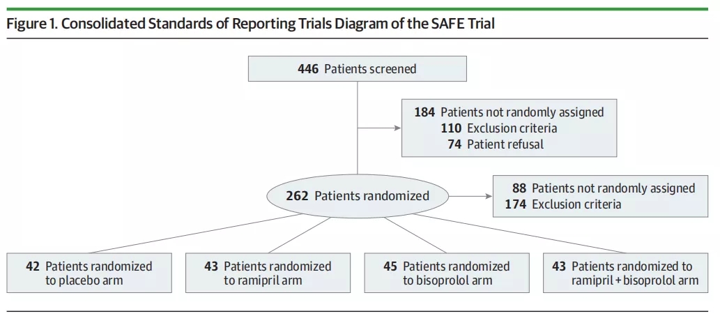为确定正在接受蒽环类化疗的乳腺癌患者药物心血管预防是否可以减少亚临床心脏损伤,研究者发起了SAFE研究。该研究是一项4组随机双盲安慰剂对照的全国多中心Ⅲ期研究。2015年7月~2020年6月,研究者在意大利的8个肿瘤科招募了174名患者(年龄24~75岁,中位年龄48岁),研究按1∶1∶1∶1的比例随机分为四组:安慰剂组42例、雷米普利组43例、比索洛尔组45例、雷米普利+比索洛尔组43例。从化疗开始或到曲妥珠单抗治疗结束,给予心脏保护治疗12个月。在12个月时完成心脏评估患者的预先指定的中期分析。通过三维(3D)和斑点跟踪心脏超声心动图对非转移性乳腺癌患者的亚临床心功能障碍进行评估。
