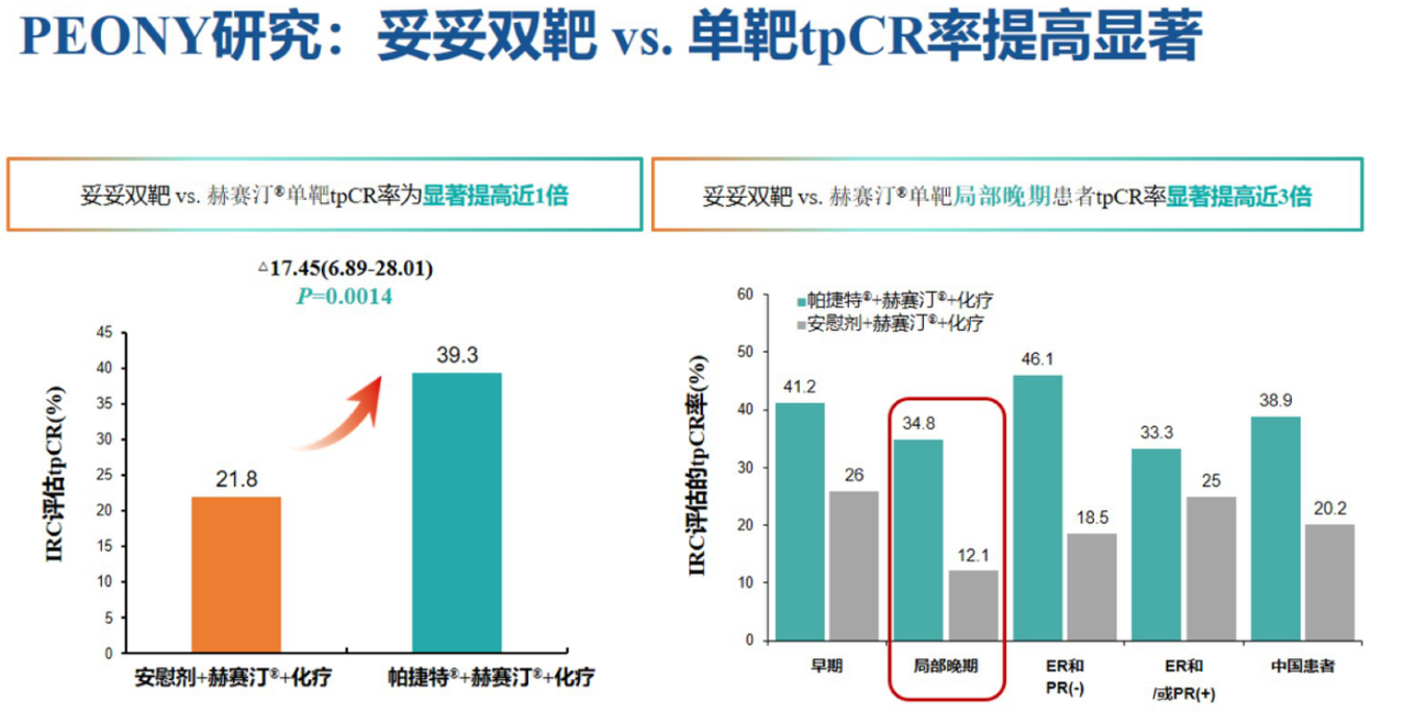 NeoSphere研究证实了曲妥珠单抗+多西他赛基础上联合帕妥珠单抗可以显著提高HER2阳性乳腺癌患者的pCR率(45.8% vs 29%)和5年DFS率(86% vs 81%,HR=0.69)。PEONY研究则是一项针对亚洲人群的Ⅲ期研究,结果显示,帕妥珠单抗+曲妥珠单抗+多西他赛与安慰剂+曲妥珠单抗+多西他赛相比,可显著提高患者tpCR率(39.3% vs 21.8%;P=0.0014)。另一项TRYPHAENA研究是对比有无蒽环(TCbHP vs FEC-THP)的曲帕双靶方案之间差异,结果显示二者的pCR率是相似的;KRISTINE研究也验证了TCbHP的远期生存获益,TCbHP新辅助达到pCR患者的3年iDFS率可达97.5%。