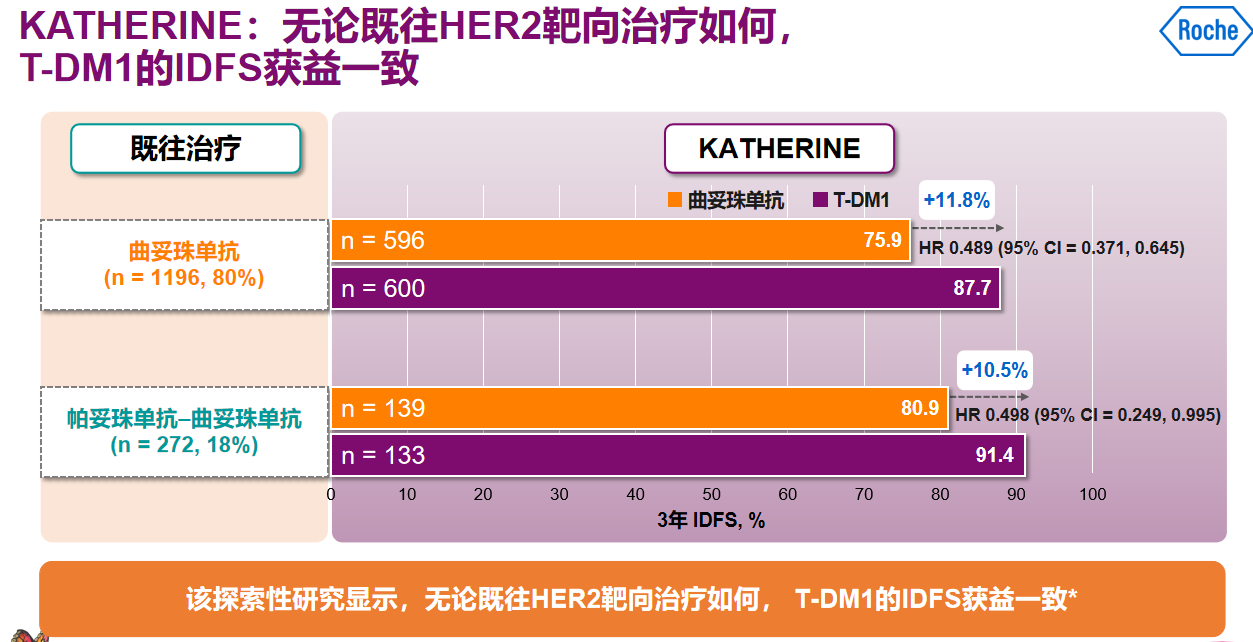 KATHERINE研究是一项针对抗HER2新辅助治疗后仍有残存病灶的乳腺癌患者强化辅助治疗显示出生存获益的Ⅲ期研究,研究结果显示,相较于曲妥珠单抗,non-pCR患者使用T-DM1强化辅助治疗可使3年iDFS率提高11.3%,浸润性疾病或死亡风险降低50%,而且各亚组的获益趋势一致。