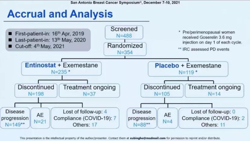 入组患者由中心交互式网络应答系统,按按2∶1比例进行随机化分层,分别在每日口服25毫克依西美坦的基础上,再口服5毫克entinostat或安慰剂,随机化过程中还将根据既往是否使用过CDK4/6抑制剂、氟维司群、化疗和是否有内脏转移进行分层。