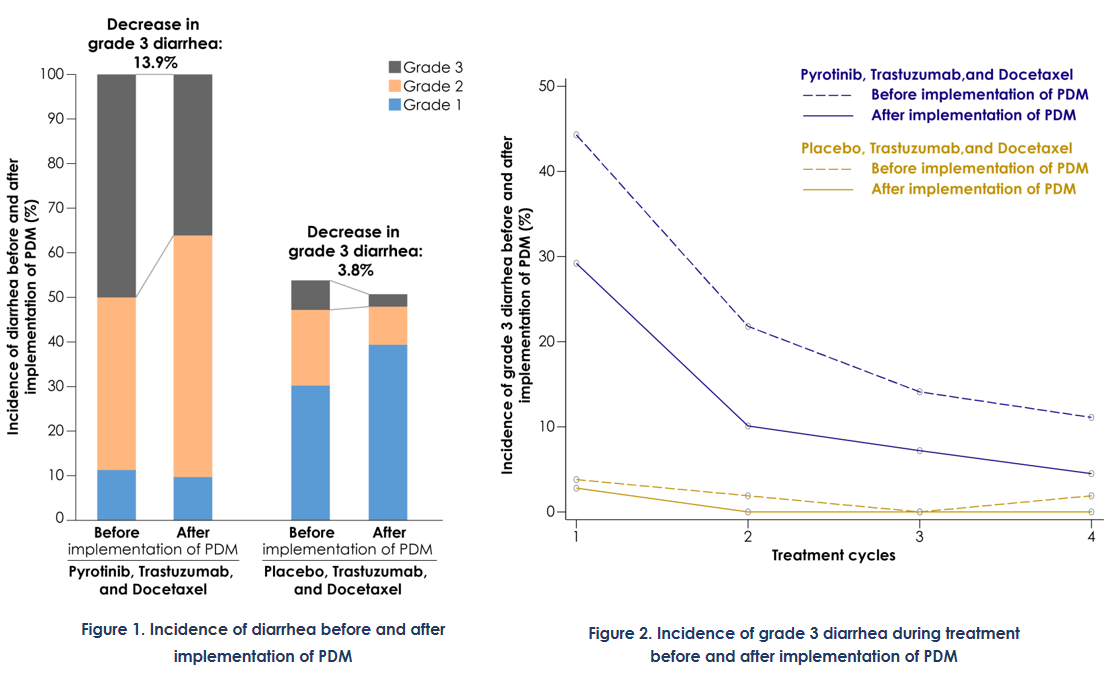 吡咯替尼是不可逆、泛-ErbB受体,靶向HER1、HER2和HER4的TKI,腹泻是其不良反应之一。多西他赛本身就有一定的致泻性,再联合吡咯替尼后患者的腹泻发生率会有所增高。PHEDRA研究初期发现3级及以上的腹泻发生率高达40%,针对这个情况我们在研究中期进行了治疗管理方案的调整,制定了PDM,选择洛哌丁胺作为抗腹泻药物并严格按照洛哌丁胺的推荐剂量进行应用,并对实施PDM前后腹泻的发生率,严重程度,持续时间等进行描述性总结分析。