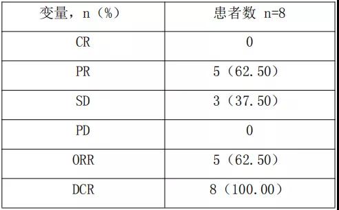 8例具有可测量病灶的患者进行了疗效评价,见表2。