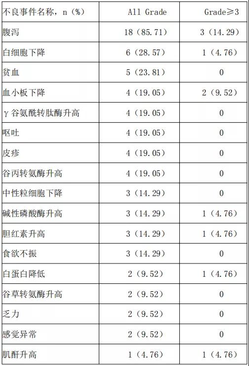 安全性方面(表3),总体不良事件发生率为100.00%,总体严重不良事件发生率为28.57%。腹泻的中位开始时间为1.5天,中位持续时间为9天,随着治疗周期的增加,总体腹泻的发生率有下降趋势。