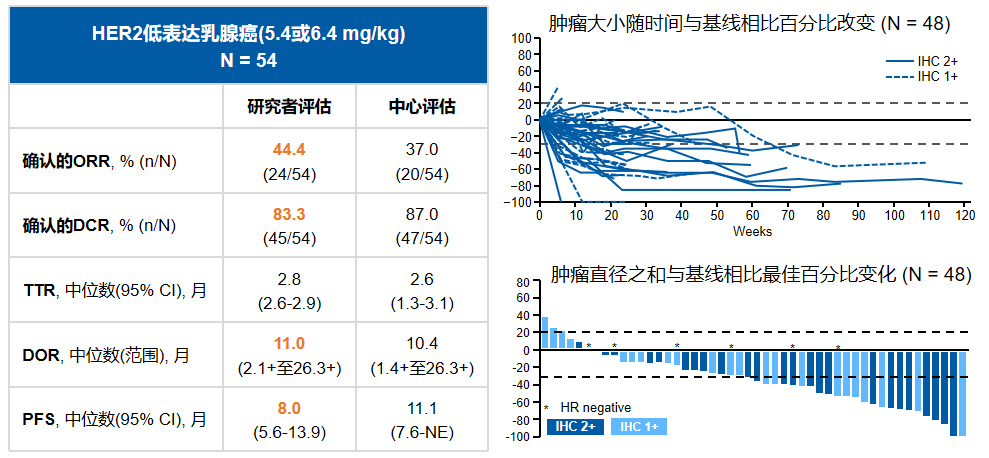在I期DS8201-A-J101研究[7]中,有54例晚期HER2低表达乳腺癌患者进入扩展阶段试验,T-DXd治疗的(研究者评估)ORR达44.4%,中位DOR和PFS分别为11.0个月和8.0个月。