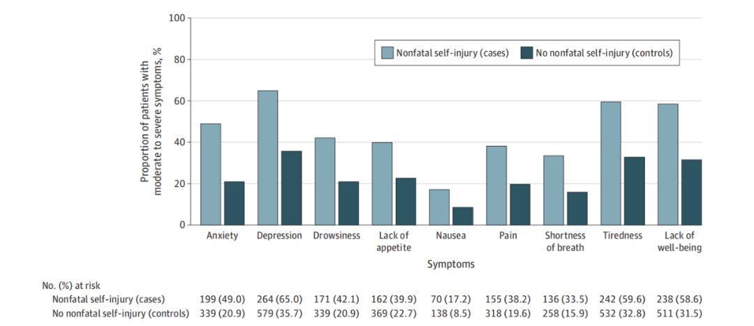 既往相关研究发表明,在1000名癌症患者中有3人出现NFSI,这比该人群中自杀的频率要高得多2。NSFI是一种以患者为中心的、客观测量的严重痛苦的表现,NFSI除了比自杀更常见外,还为高危患者的识别和降低患者风险干预提供了机会。