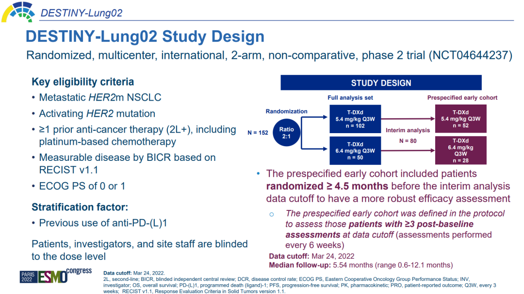Koichi Goto, et al. 2022 ESMO LBA55 - Trastuzumab deruxtecan (T-DXd) in patients (Pts) with HER2-mutant metastatic non-small cell lung cancer (NSCLC): Interim results from the phase 2 DESTINY-Lung02 trial. Annals of Oncology (2022) 33 (suppl_7): S808-S869. 10.1016/annonc/annonc1089