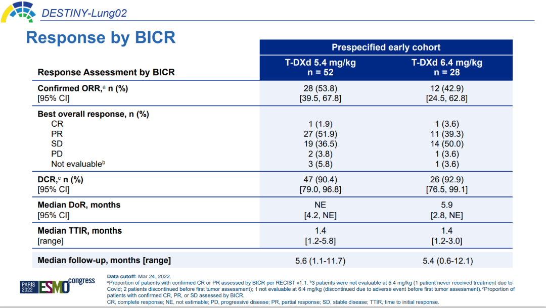 任胜祥教授:DESTINY-Lung02研究是一项双盲、随机、Ⅱ期临床研究,主要目的是探索T-DXd 5.4mg/kg Q3W对比6.4mg/kg Q3W的疗效和安全性。主要研究终点是独立评审中心(BICR)评估的确认的客观缓解(cORR);次要研究终点包括BICR评估的持续缓解时间(DoR)、确认的疾病缓解率(cDCR)、安全性。