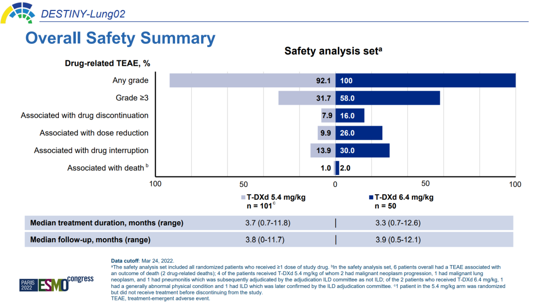 安全性方面,5.4mg/kg组与6.4mg/kg组≥3级不良反应的发生率分别为31.7%和58%,6.4mg/kg组的不良反应发生率与DESTINY-Lung01研究一致。在临床最为关注的间质性肺炎(ILD)方面,5.4mg/kg组发生率仅5.9%,而6.4mg/kg 组发生率为14%,两组ILD多为1~2度,仅1例3度ILD,无4度发生。