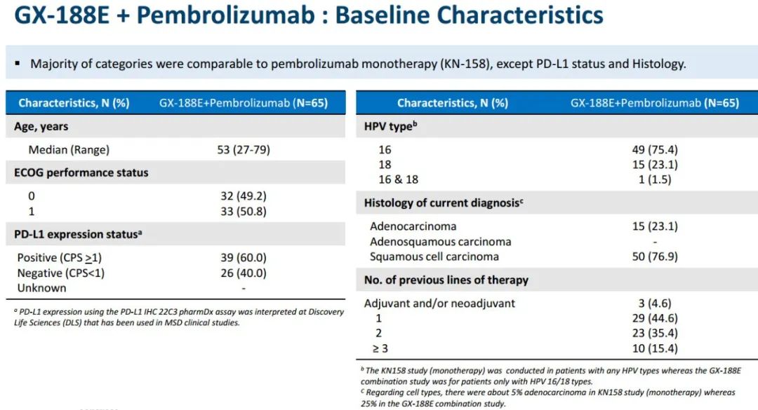 研究共纳入65例受试者,中位年龄为53岁;其中PD-L1阳性患者39例,PD-L1阴性患者26例;ECOG PS评分为0和1的患者约各占一半;HPV 16阳性患者占比更大(75.4%);鳞状细胞癌患者占76.9%,腺癌患者占23.1%;既往接受1线、2线和≥3线治疗的患者分别占44.6%、35.4%和15.4%。与帕博利珠单抗单药研究KEYNOTE-158相比,除患者的PD-L1状态、组织学类型和HPV类型以外,大多数基线特征相符。