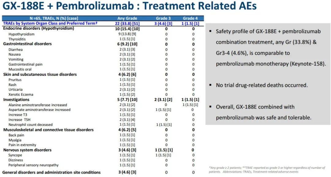 65例患者中有22例(33.8%)发生任何级别的治疗相关不良事件(TRAE),其中3例(4.6%)发生3级或4级TRAE。任何级别和3/4级TRAE的发生率与帕博利珠单抗单药的数值相近(与KEYNOTE-158研究)。