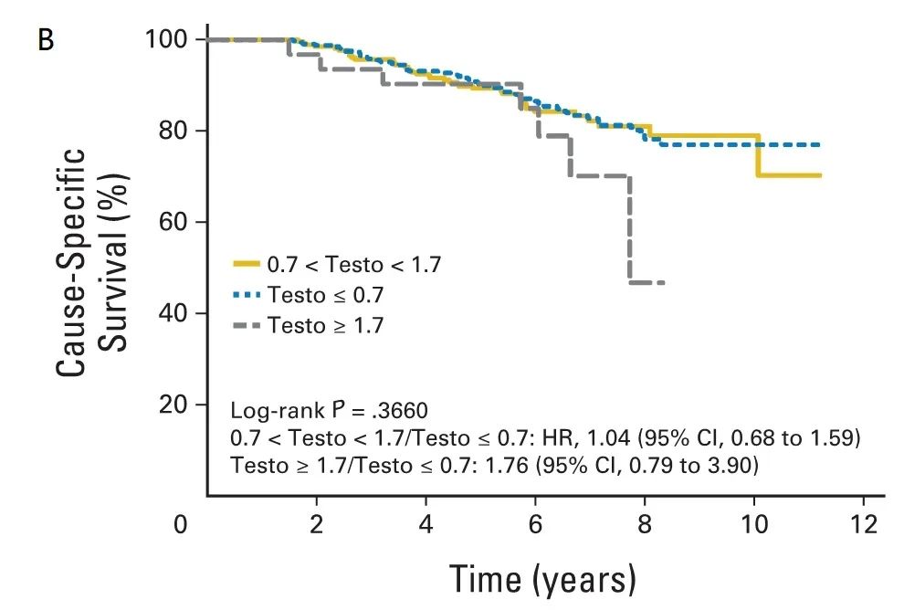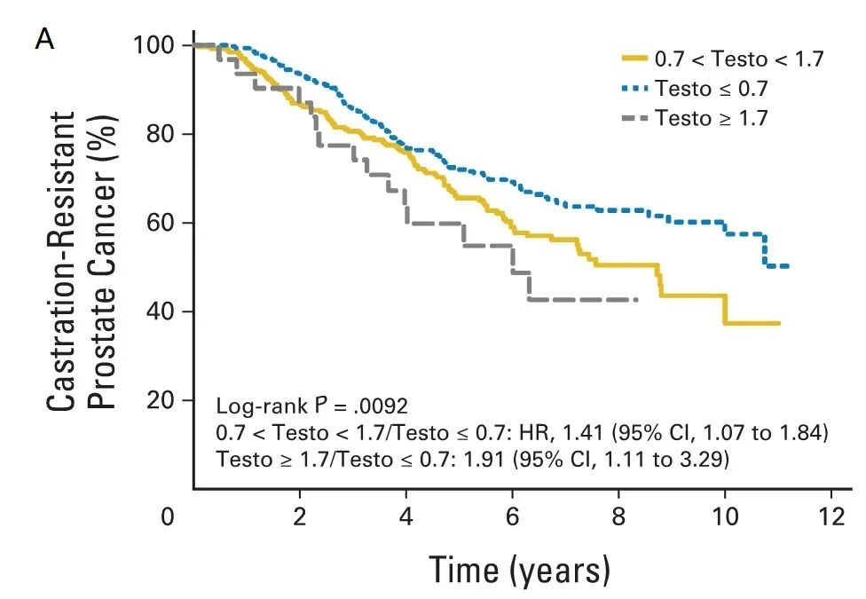 一项纳入153例前列腺癌患者的单中心、前瞻性、单臂队列研究结果显示,相比于睾酮>20 ng/dl,睾酮<20 ng/dl的患者死亡风险降低81%,疾病进展风险也有降低趋势,而50 ng/dl阈值线与死亡风险和进展风险均无关[4]