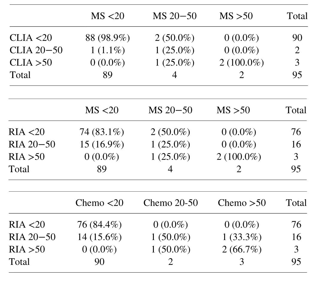 进一步的亚组分析显示,采用CLIA和RIA法检测睾酮值>20 ng/dl的24例患者以MS法检测时,16例睾酮值<20 ng/dl,即CLIA和RIA法高估了66.7%的患者的睾酮值,在全队列中睾酮值高估的比例为16.8%。而采用CLIA和RIA法检测睾酮值<20 ng/dl的90例患者以MS法检测时,4例睾酮值>20 ng/dl,即CLIA和RIA法低估了4.4%患者的睾酮值,在全队列中睾酮值低估的比例为4.2%。