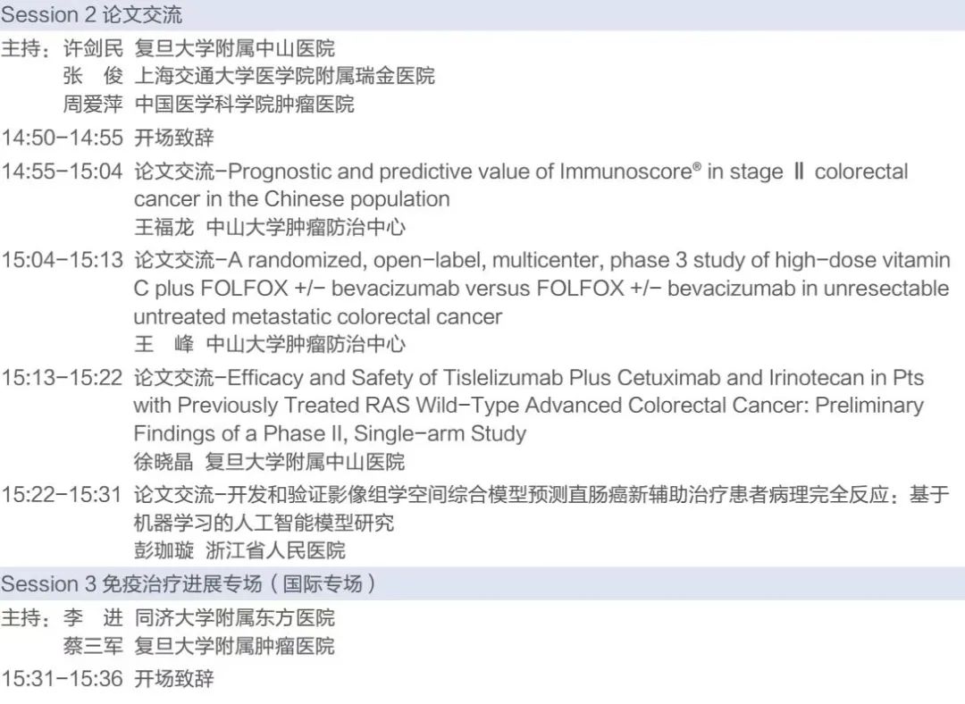结直肠癌专场1将在session 1探讨局部晚期肠癌的术前治疗策略优化;session 2将展示国内结直肠癌领域的一系列优秀研究成果,session 3的国际专场将邀请多个国际知名结直肠癌专家分享结直肠癌免疫治疗进展。