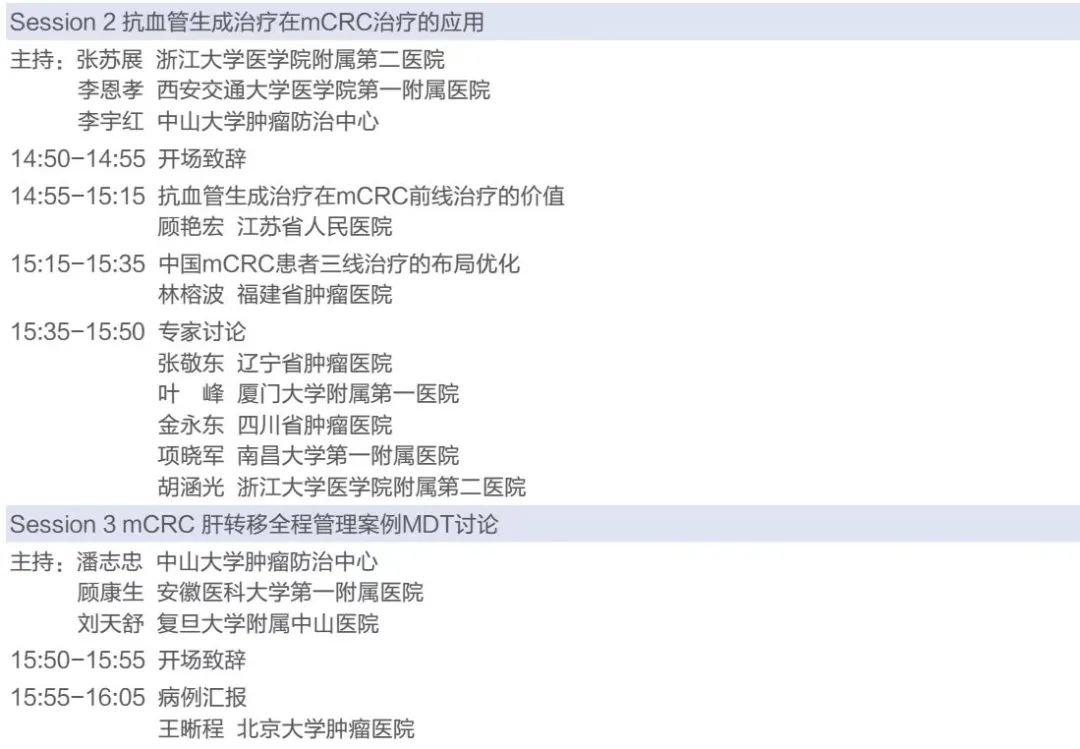 结直肠癌专场2将在session 1探讨mCRC的精准医学实践;session 2将解读抗血管生成治疗在mCRC治疗中的应用,session 3将直播mCRC肝转移全程管理案例MDT讨论过程。