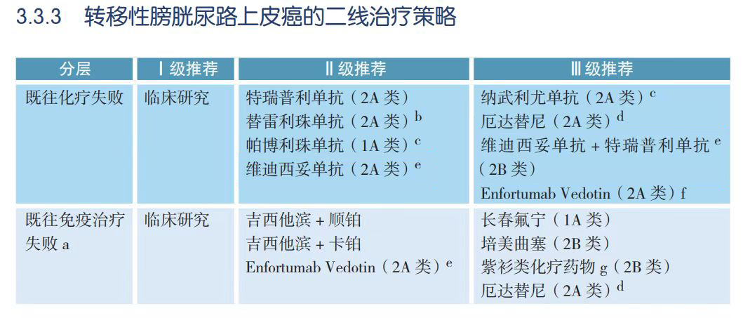 对于“既往免疫治疗失败”的患者,吉西他滨联合铂类化疗仍是主要选择,除此以外,Ⅱ级推荐中增加了Enfortumab Vedtin,主要基于EV201研究队列2的数据,在免疫治疗失败的铂类不能耐受人群中,该方案的ORR为51%,中位DOR为13.8个月,中位PFS和OS分别为6.7个月和16.1个月,美国FDA已经批准其相关适应症,但和FGFR抑制剂厄达替尼一样在国内尚不可及。