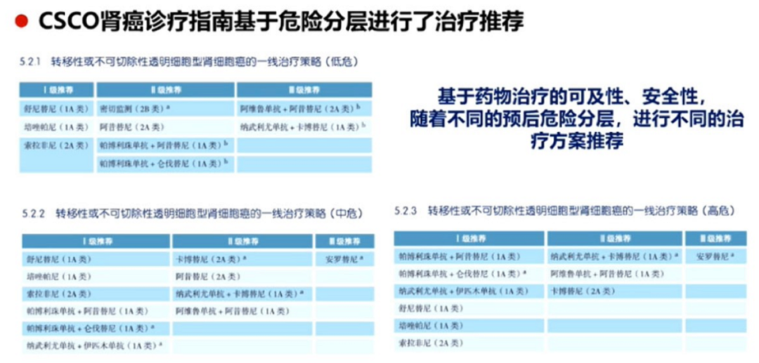 在不可手术转移性透明细胞癌的一线治疗中,依然按照危险程度进行分层推荐。