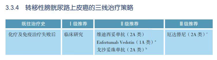 三线治疗Ⅰ级推荐仍然是参加临床研究,Ⅱ级推荐以单药ADC为主,其中HER-2 ADC维迪西妥单抗、Nectin-4 ADC Enfortumab Vedtin是由Ⅲ推荐调整Ⅱ级推荐,Trop-2 ADC戈沙妥珠单抗是新增的Ⅱ级推荐。TROPHY-U-01研究队列1(经化疗和免疫治疗失败)中,戈沙妥珠单抗的ORR为27%,中位PFS和OS分别为5.4个月和10.9个月。