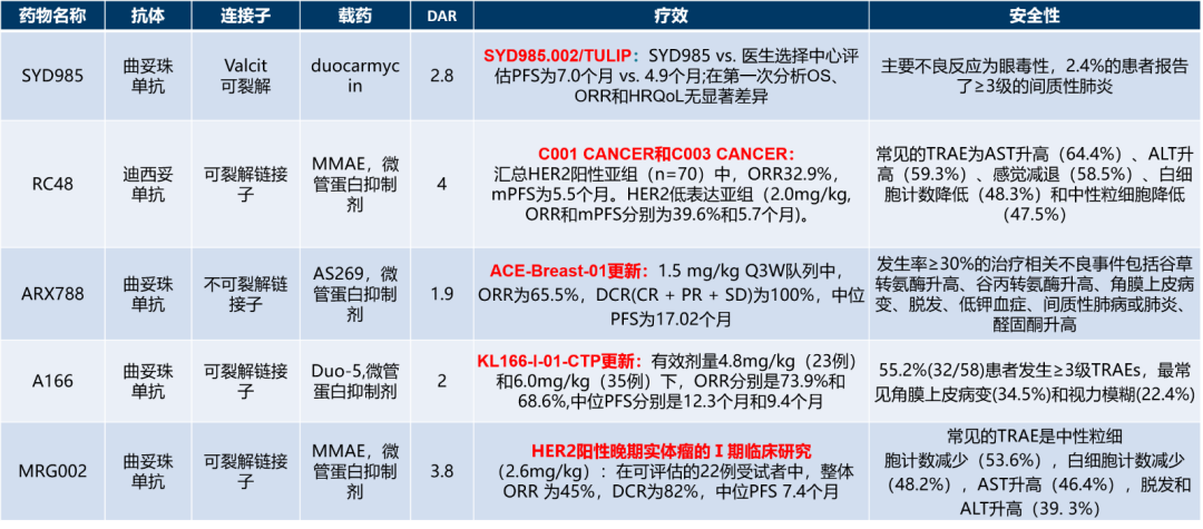 同时,我们也看到国内外有诸多ADC正在被开发或已进入临床论证阶段。有以T-DM1对标的BAT8001、TAA013、GQ1001、SHR-A1201等。也有以T-DM1为基础,对抗体分子、连接子或细胞毒性药物进行优化的SYD985、RC48、A166、MRG002以及改良偶联技术的ARX788等。
