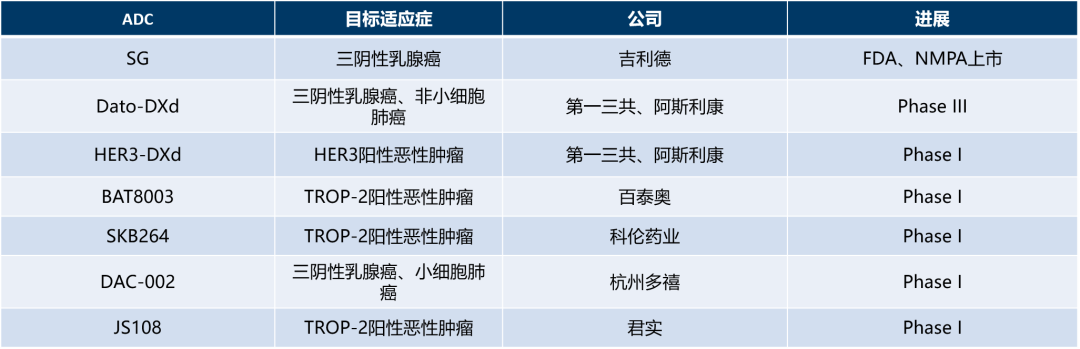 除了针对HER2靶点外,针对其他靶点如TROP2、HER3等的ADC也在紧锣密鼓的开展当中。其中尤以SG、Datopotamab deruxtecan(Dato-DXd;DS-1062)和Patritumab deruxtecan(HER3-DXd;U3-1402)进展较为迅速。针对SG,除ASCENT、TROPiCS-02研究外,更多的Ⅰ~Ⅲ期研究正在开展旨,在探索SG(新)辅助获益以及不同的联合治疗策略。
