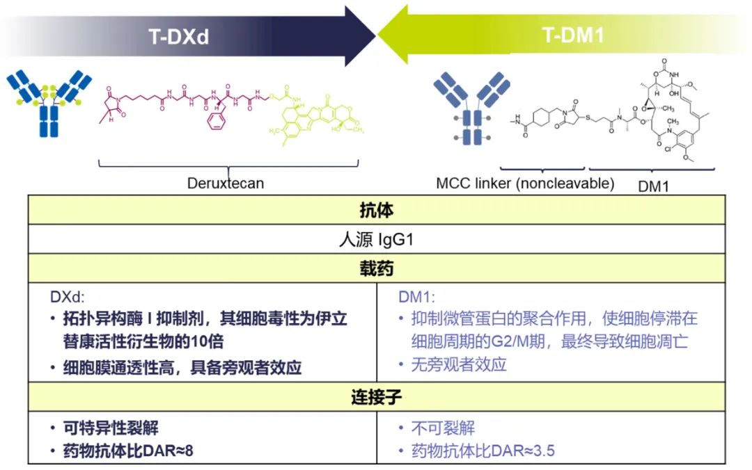 德曲妥珠单抗(Trastuzumab Deruxtecan,DS-8201/T-DXd,Enhertu)是继T-DM1之后新一代ADC,虽然均采用了曲妥珠单抗作为其抗体部分,但在结构上与T-DM1有着显著的不同。首先,载药部分T-DXd选取了一种新型的拓扑异构酶Ⅰ抑制剂(DXd)。DXd由喜树碱衍生而来,抗肿瘤活性是传统化疗药物的~1000倍。T-DM1则采用了传统的微管抑制剂(DM1);其次,连接子方面T-DXd设计了一种亲水性较好且可被肿瘤细胞中高表达的组织蛋白酶特异性裂解的GGFG四肽连接子,这一设计使得T-DXd具有更高的药物抗体比(DAR,8:1)、能够释放完整游离的DXd、以及充分地发挥旁观者效应。