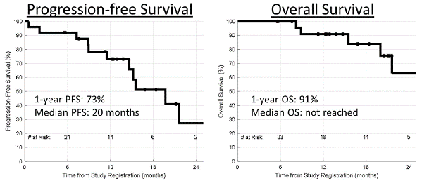 局晚期NSCLC的选择性个性化放免联合治疗研究SPRINT是创新性生物标志物驱动的前瞻性II期临床研究,探索LA-NSCLC局部和系统治疗模式的转变。关键入组标准包括不可切除的II期或III期NSCLC,ECOG PS 0-1,PD-L1 TPS≥50%(采用22C3免疫组化检测),TPS较低的受试者将被纳入单独的队列,并接受放化疗。试验组纳入25例(PD-L1 TPS≥50%),采用帕博利珠单抗200 mg/21天,3个周期,随后采用PET-剂量雕刻放疗(肿瘤/淋巴结代谢容积<20cc:48Gy,分20次进行;肿瘤/淋巴结代谢容积>20cc:55Gy,分20次进行)治疗4周,再进行帕博利珠单抗200 mg/21天,12个周期的维持治疗。对照组38例(PD-L1 TPS<50%),采用标准放化疗和辅助治疗。研究主要终点为1年PFS,假设该值将超过65%;次要终点包括不良事件(CTCAE v.4.03)、CT(RECIST)和PET(PERCIST)显示的对帕博利珠单抗诱导后的反应,以及OS。探索性分析表明,帕博利珠单抗诱导后PET的肿瘤应答情况与良好的PFS相关,1年PFS率73%,1年OS率91%(图6,图7)。
