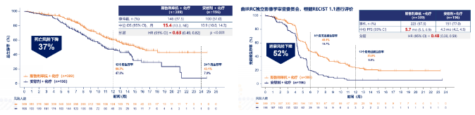 这项国际多中心、随机、双盲Ⅲ期临床研究,探讨了斯鲁利单抗联合化疗对比标准化疗在ES-SCLC一线治疗中的有效性和安全性。2022年ASCO会议上公布了中期分析数据,结果显示,斯鲁利单抗联合化疗组(试验组)较化疗组(对照组)可显著延长ES-SCLC患者的OS(15.4m vs 10.9m;HR=0.63)和无进展生存时间(Progression-Free Survival,PFS)(5.8m vs 4.3m;HR=0.47;P<0.001)(如图1);且试验组在客观缓解率(Objective Response Rate,ORR)(80.2%vs 70.4%)和缓解持续时间(Duration of Response,DoR)(5.6m vs 3.2m)方面同样存在明显的优势,显示出较高的肿瘤缓解率和持久的肿瘤缓解能力。该研究证实了PD-1抑制剂也可以为ES-SCLC患者带来生存获益,且首次将ES-SCLC患者的中位OS提高至15.4个月,亚裔人群数据更优,中位OS延长了4.8个月,疗效卓越,刷新了目前PD-L1抑制剂研究中中位OS仅12-13个月的数据。ASTRUM-005研究结果表明,对于初治的ES-SCLC患者而言,斯鲁利单抗联合化疗安全性和耐受性良好,患者依从性好,能提供良好的长期生存获益。因其出色的研究成果,ASTRUM-005研究结果的论文已于2022年9月发表于《美国医学会杂志》(JAMA)主刊,其研究意义和研究质量得到了国际顶级医学期刊的认可。在刚刚过去的ESMO ASIA大会上,程颖教授口头报道了ASTRUM-005的最新数据,经过19.8个月随访,意向性治疗(ITT)人群斯鲁利单抗联合化疗组中位OS较对照组延长了4.7个月,达15.8个月;亚裔人群中位OS延长了4.8个月,达15.9个月。斯鲁利单抗联合化疗方案再次刷新了ES-SCLC一线治疗生存数据新高度,有望重塑ES-SCLC免疫治疗新格局!