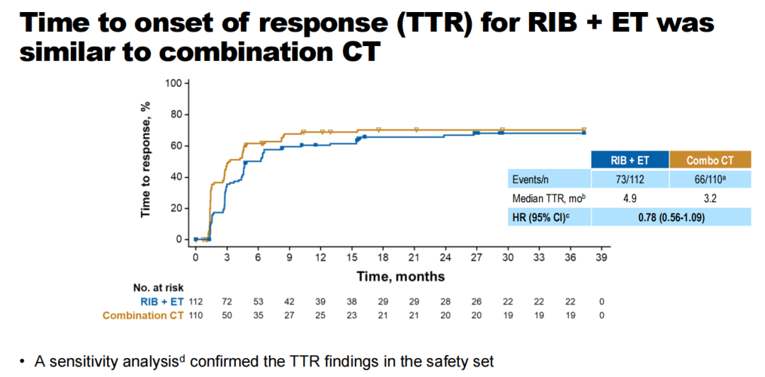 因此,对于这部分人群,至肿瘤缓解时间(TTR)就是关键的观察指标。如果这种治疗方案至肿瘤缓解时间越短,就意味着患者在短期内获得了肿瘤缓解,之后有更多接受后线治疗的机会。RIGHT Choice研究中也将TTR作为了次要研究终点,结果显示两组患者的TTR分别为4.9 vs 3.2个月(HR 0.78,95%CI:0.56~1.09),虽无统计学差异,但提示我们化疗的至肿瘤缓解时间更短。