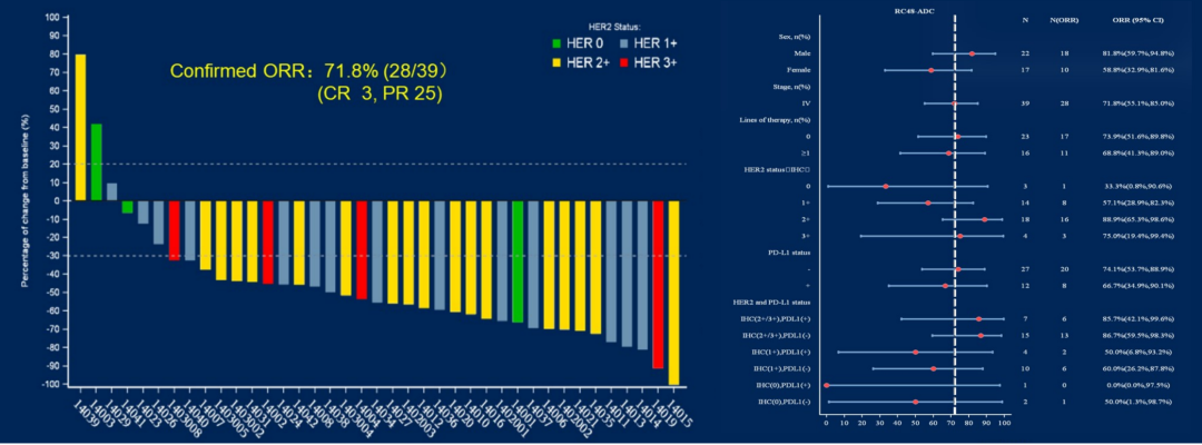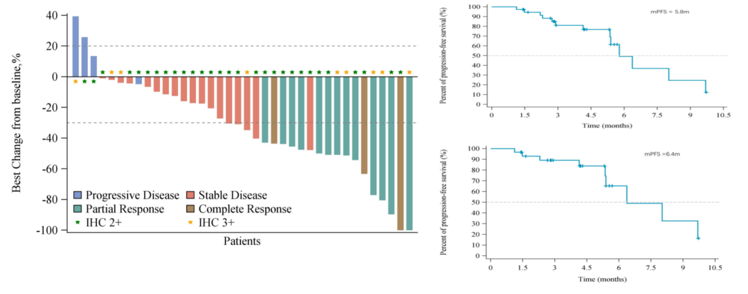 国内的维迪西妥单抗已经在后线治疗也取得了一系列不俗的成绩,并已经获得国内相关适应症批准和CSCO指南推荐。此外,MRG002是国内另一种新型HER-2 ADC,在晚期UC患者中也取得了不错的疗效(ITT人群ORR为55%;化疗和免疫失败患者的ORR为63%)。