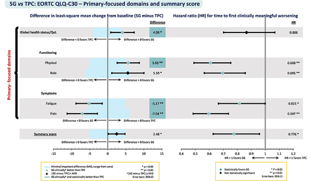 安全性方面,SG和TPC两组主要的≥3级不良反应分别是腹泻(11%vs 0.4%)和中性粒细胞减少症(52%vs 33%),两组因不良事件导致治疗中断的发生率均≤3%,安全可耐受[5]。生活质量(QoL)方面,SG较TPC在整体生存状况/生活质量(GHS/QoL)、生理机能(PF)、生理职能(RF)、虚弱、疼痛五个QoL维度的得分均具有显著改善[9]