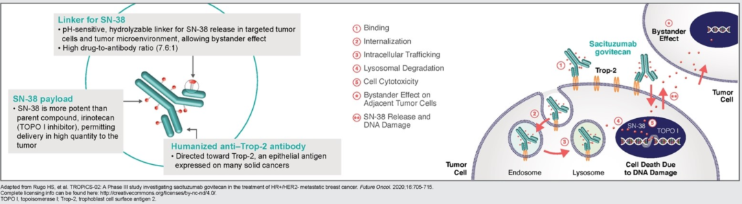 SG主要包括抗体、连接子和载荷三部分:抗体部分为人源化单克隆抗体hRS7能够与Trop-2靶点精准结合;可裂解的连接子CL2A能使SG在肿瘤细胞内及肿瘤微环境中裂解释放细胞毒载药,发挥“旁观者效应”;细胞毒载药为伊立替康活性代谢物SN-38,其对DNA拓扑异构酶I的抑制作用是伊立替康的100-1000倍,与传统化疗交叉耐药可能性小,作用强大;高达7.6:1的药物抗体比(DAR)则进一步加强了SG的抗肿瘤活性。