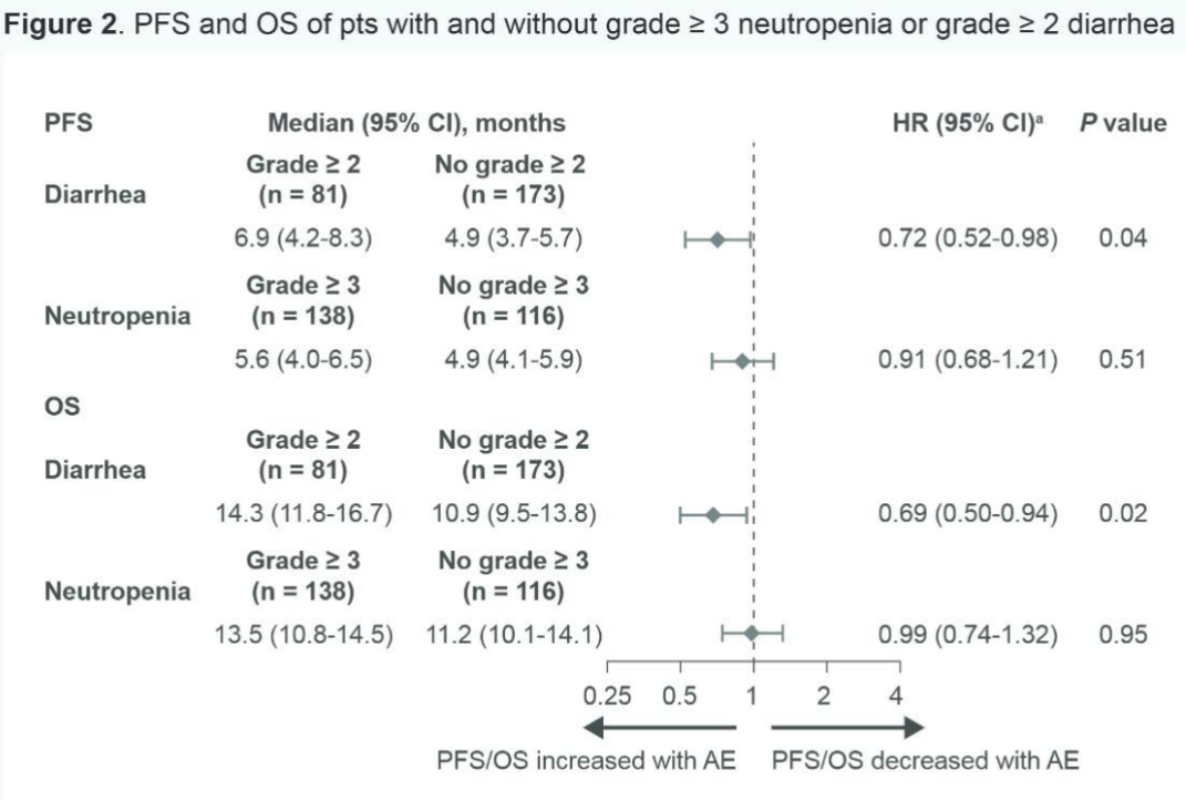 发生≥3级中性粒细胞减少或≥2级腹泻的经治mTNBC患者,临床预后与总体人群一致,不会受到不良事件的影响。发生≥2级腹泻的患者,相比未发生腹泻的患者OS有所改善;然而,在时变Cox模型中,校正年龄、种族和BMI后,没有观察到显著差异。研究局限性包括来自开放标签研究的潜在报告偏差和该分析的事后性质。使用现行指南对中性粒细胞减少症和腹泻进行积极监测和早期干预,可以延长SG的治疗持续时间并持续获益。