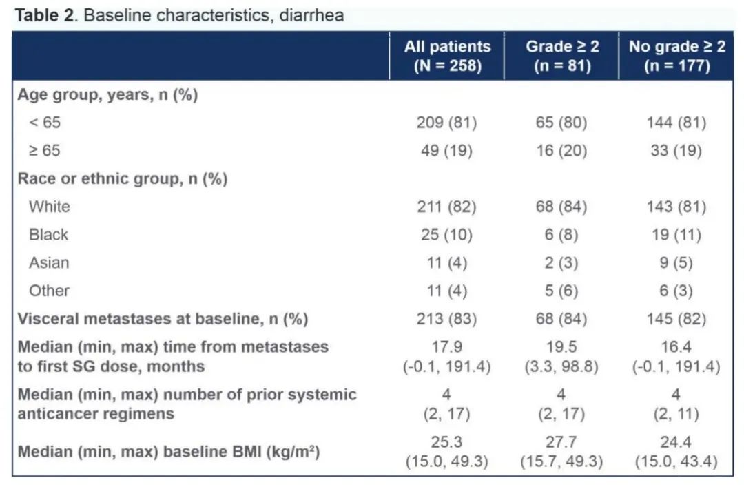 对于本分析中接受SG治疗的受试者,≥3级中性粒细胞减少的发生率为54%(n=139),≥2级腹泻的发生率为32%(n=81)。出现中性粒细胞减少或腹泻的受试者基线特征大致相似(表1和表2);发生≥2级腹泻的患者身体质量指数(BMI)最高。只有1例因腹泻(非严重2级事件)而停药,并被评估为与研究药物无关,且已解决。没有5级中性粒细胞减少或腹泻的发生。