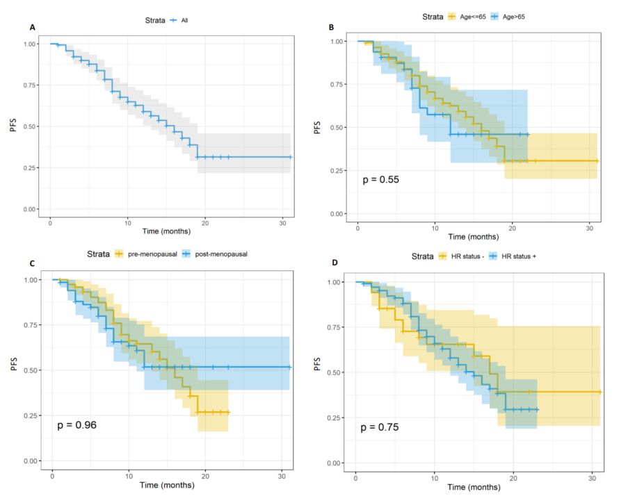 图2.基于:1)整体人群;B)年龄;C)绝经状态;4)HR状态的PFS