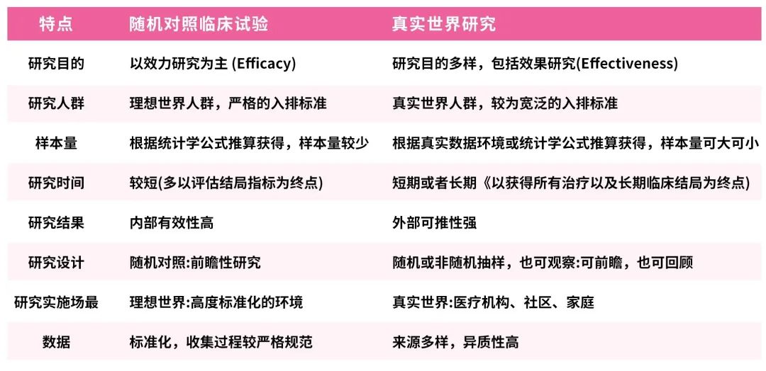 表1.随机对照临床试验与真实世界研究区别对照表