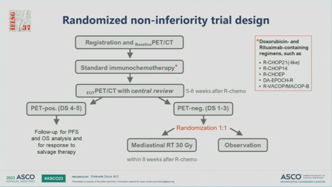 PMBCL通过剂量强化的免疫化疗可迅速缓解,预后良好。在此基础上序贯纵隔放疗(RT)可能会巩固疗效,然而也增加了继发第二恶性肿瘤和冠状动脉或瓣膜性心脏病的风险。本项研究(IELSG37试验)采用非劣效性设计,以评估免疫化疗后获得完全代谢缓解(CMR)的患者是否可以省略纵隔RT。