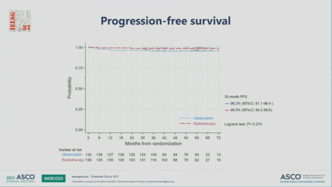 原文链接:Emanuele Zucca,Andrew Davies,Irina Kryachok,et al.Observation vs.radiotherapy in primary mediastinal B-cell lymphoma patients with complete response to standard immunochemotherapy:The IELSG37 randomized trial.ASCO 2023 Abstract LBA7505