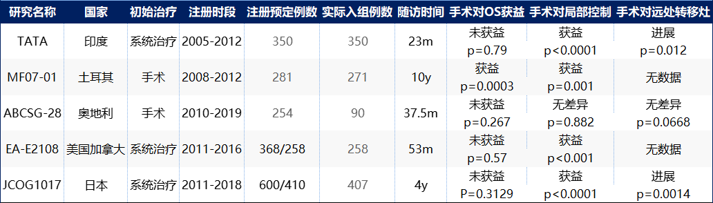 大部分回顾性临床研究认为初诊Ⅳ期乳腺癌行原发灶局部手术后总体生存是获益的,正因如此,有了后续世界五个中心就这一问题分别设计的前瞻性随机对照研究。五项研究几乎同时期开展。试验设计思路大致分为两种模式,一种为先行系统治疗从而筛选出治疗有效者,再对其进行随机分组,一组继续系统治疗一组切除原发灶,后续均持续系统治疗。代表研究为印度的TATA研究(350例)、美国的ECOG-ACRIN E2108研究(256例)、日本的JCOG1017研究(407例);另一种则是诊断为初诊Ⅳ期乳腺癌即刻进行随机分组,一组系统治疗一组切除原发灶,后续系统治疗。代表研究为土耳其的MF07-01研究(274例)、奥地利的ABCSG-28研究(90例)。总体上看,除MF07-01研究外,其余研究均未观察到切除原发病灶组总体生存获益。而MF07-01研究不但存在组间失衡(两组在ER表达、成骨性转移比率、三阴性乳腺癌比例差异)问题,且未行P-value多重检验。其结果备受争议。