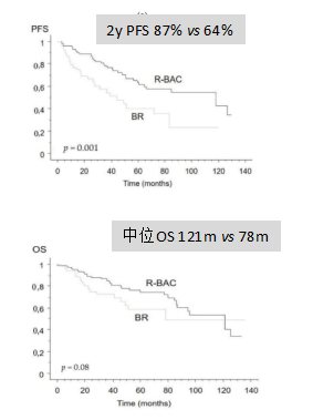 ② 对于TP53非突变、不适合移植的MCL患者的治疗:对于此部分MCL患者的治疗方面,2023年NCCN指南已经不再推荐改良Hyper-CVAD联合利妥昔单抗作为>65岁初治MCL患者的非强化治疗方案。在研究进展上,2021年《Cancer》杂志上一项研究比较了利妥昔单抗+苯达莫司汀(BR方案)vs 利妥昔单抗+苯达莫司汀+阿糖胞苷(R-BAC方案)在老年初治MCL患者中的疗效,结果显示:R-BAC方案在中位OS和PFS方面均占优,中位OS分别为121个月vs 78个月,2年PFS分别为87% vs 64%,详见下图。