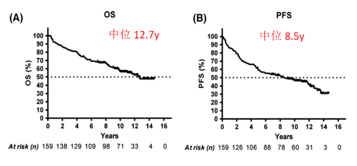 在治疗方面, 既往的研究已经表明R-CHOP样方案治疗在套细胞淋巴瘤患者中的疗效不佳,而2016年《英国血液学杂志》(British Journal of Haematology)上更新了Nordic MCL2研究长达15年的随访结果,其结果显示,强化治疗方案能改善MCL患者的生存,其中位总体生存(OS)达到了12.7年,中位无进展生存(PFS)则达到了8.5年(见下图)。