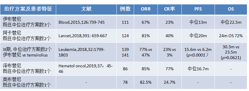 需要指出的是,除强化治疗方案具有较好疗效之外,套细胞淋巴瘤对于多种靶向药物同样具有较为突出的疗效,其中代表性的药物主要包括BTK抑制剂、来那度胺、BCL-2抑制剂及蛋白酶体抑制剂等。尤其在套细胞淋巴瘤的挽救治疗中,BTK抑制剂是指南推荐的优选方案,根据已有的研究数据显示,伊布替尼、阿卡替尼、泽布替尼及奥布替尼均有不俗疗效,单药治疗的客观缓解率(ORR)在67%~85%之间,完全缓解率(CR)为23%~77%之间(具体见下表)。另外,来那度胺、硼替佐米及维奈克拉等药物也具有一定的疗效。