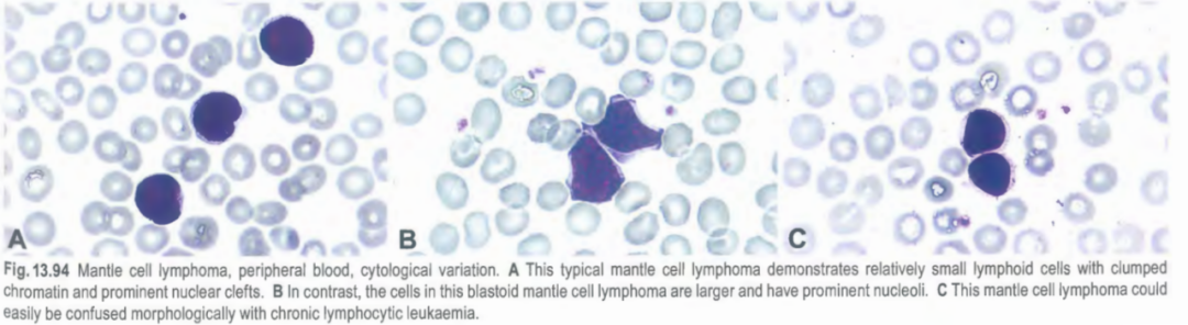 在病理诊断方面:①在细胞形态学上,MCL的肿瘤细胞为小至中等大小的淋巴细胞,胞质少,染色质成团,核仁不明显,核裂隙明显。套细胞淋巴瘤的生长模式包括弥漫性、结节性(与滤泡性淋巴瘤相比结节更模糊且不太离散)、套区淋巴瘤伴套区扩张和原位套细胞瘤(具有特征性t(11;14)的典型细胞,散在分布于其他外观正常淋巴结的外套膜区)。