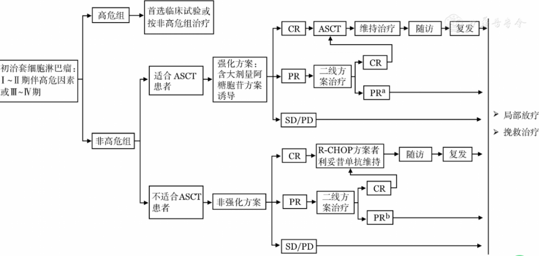 2.分型(经典型vs 惰性):对于惰性型MCL患者,若无症状,则可选择观察随诊,暂不治疗。若存在症状,则应同经典型一样积极治疗。