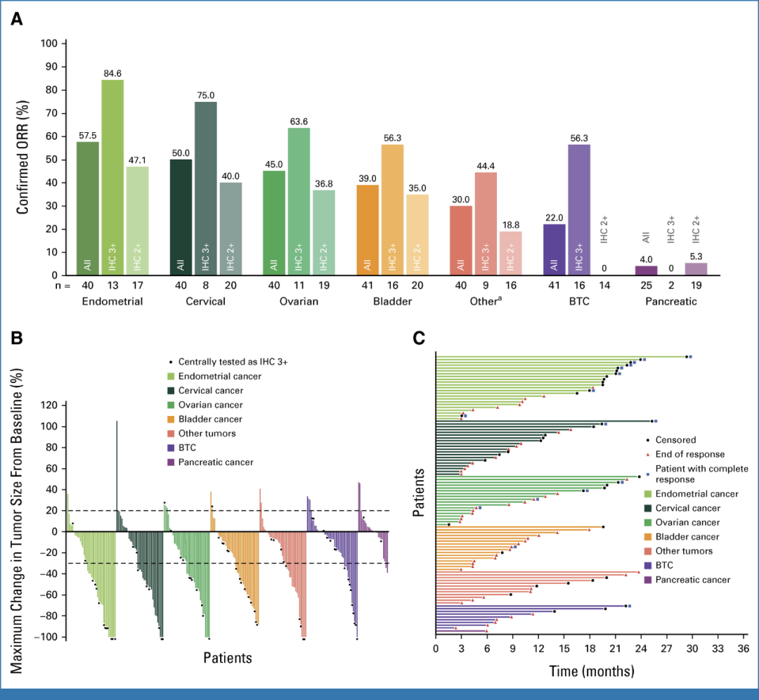 图1.研究者根据RECIST 1.1评估了应答情况。(A)根据HER2状态,不同肿瘤队列的ORR。(B)根据肿瘤类型,肿瘤大小的最大变化。(C)根据肿瘤类型,客观缓解患者的DOR。