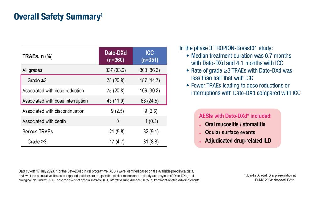 在TROPION-Breast01研究中,2024 ESMO BC大会上最新公布的数据显示,特别关注的不良事件通常为低级别、易于管理且不会影响患者预期的治疗。