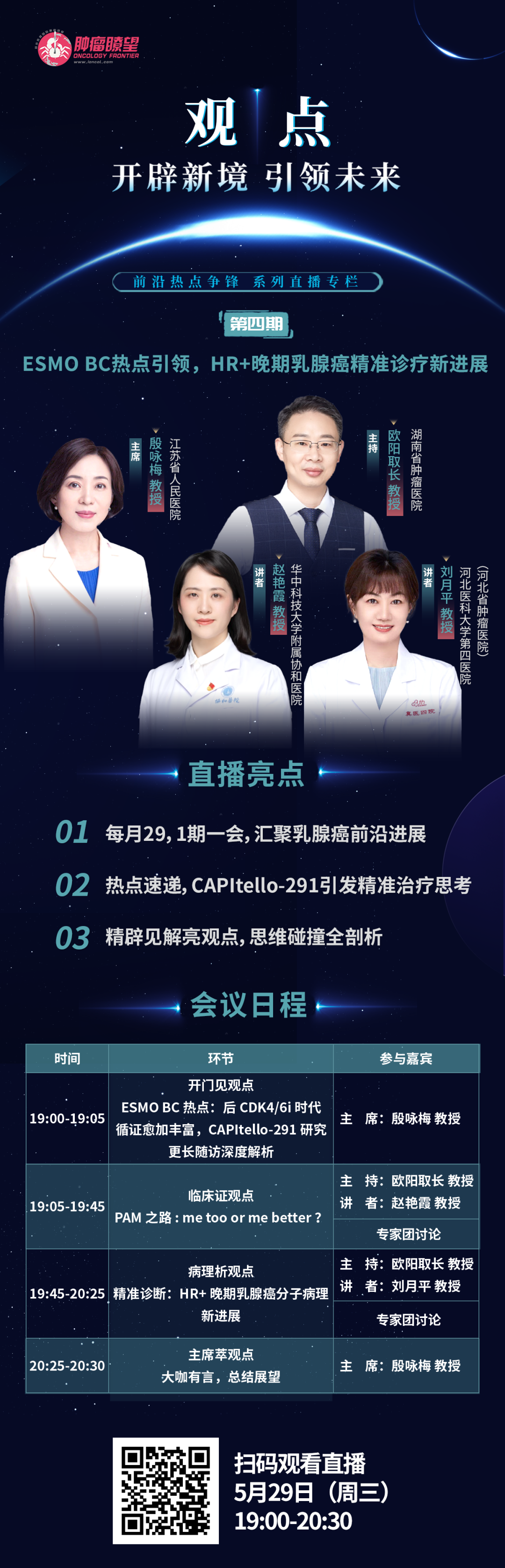 2024年5月29日晚19:00-20:30,《观点》第四期与您相约线上。本次会议由江苏省人民医院殷咏梅教授担任主席,湖南省肿瘤医院欧阳取长教授担任主持,华中科技大学同济医学院附属协和医院赵艳霞教授和河北医科大学第四医院刘月平教授将分别带来“PAM之路:me too or me better?”和“精准诊断:HR+晚期乳腺癌分子病理新进展”的主旨报告。肿瘤临床和病理的专家将在上述HR+晚期乳腺癌热点问题的讨论中碰撞出更多精彩的观点。